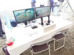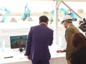 当日は、山口知事による遠隔操作を用いた「鍬入れ」や嘉瀬小学校の6年生の皆様にミニチュアの重機を用いて遠隔操作体験を行って頂きました。